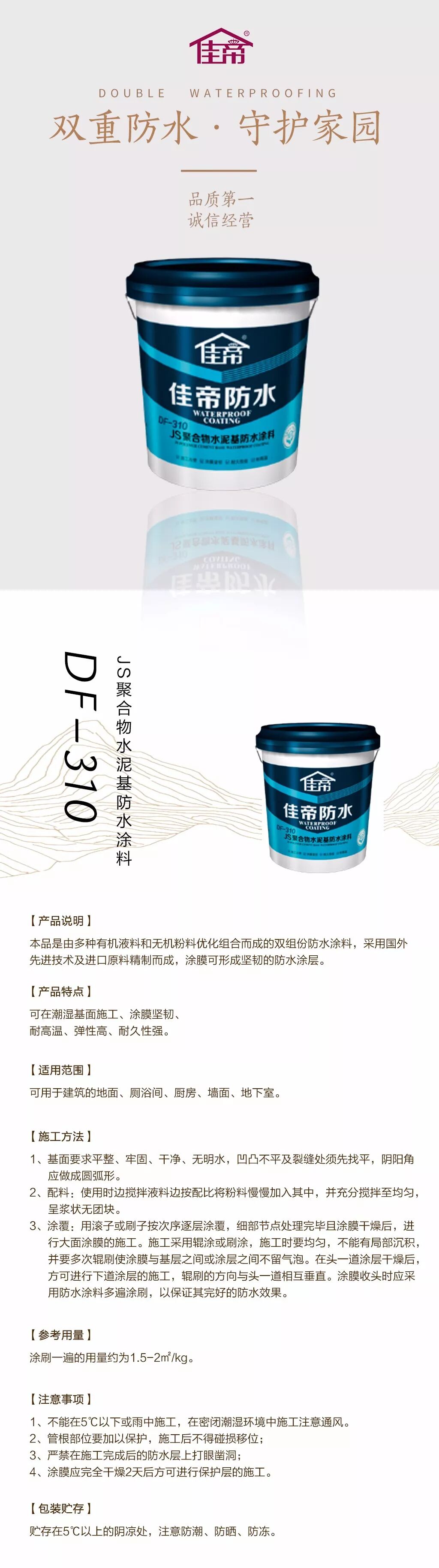 在佳帝防水系列產品中,擁有多款柔性防水材料和剛性防水材料。我們在選擇使用的產品時一定要多注意產品的適用范圍。且因為不同產品的產品特性,在施工手法上也會有些不同。